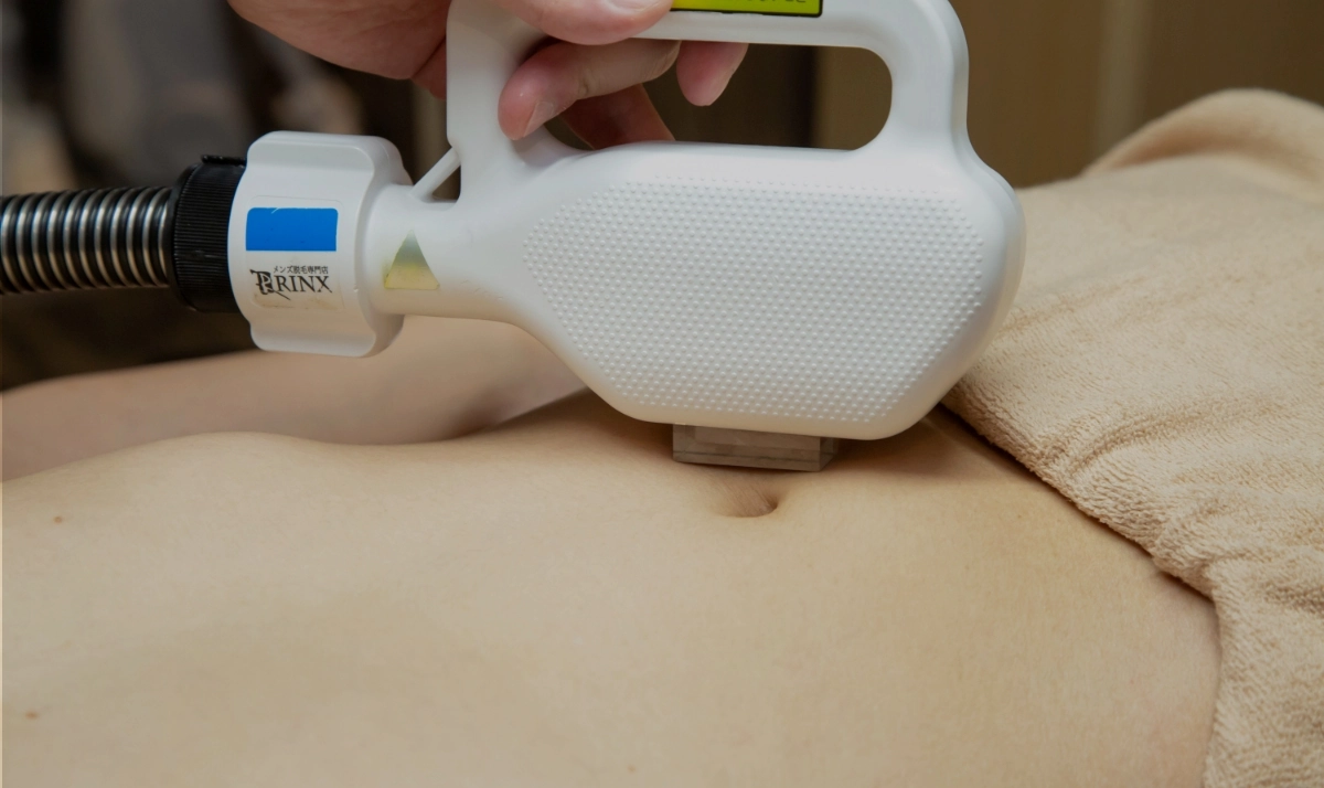 へそ周りの脱毛の痛みに関しては、照射時に輪ゴムではじかれるような感覚です。RINXのオリジナル脱毛機は特大サイズの冷却装置を搭載し、痛みの少ない脱毛をご提供しています。照射時は脱毛技能士が痛みの具合を確認しながら施術をしますので、ご安心ください。