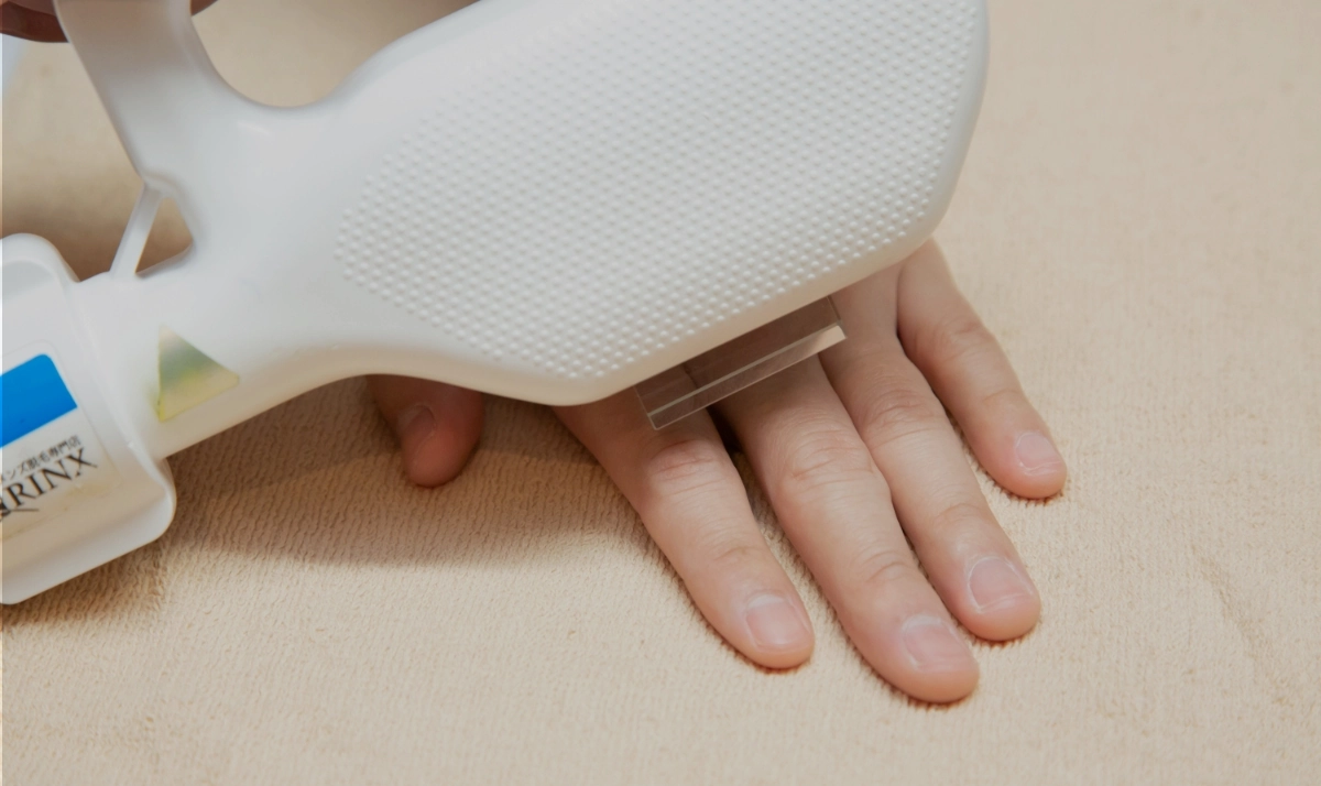 RINXで使用しているオリジナル脱毛機は、肌に優しい光なのでご安心ください。照射後に皮膚を守るジェルも塗布することで肌トラブルを防止しています。両手の指脱毛後は自宅で脱毛部位の保湿をしていただくと、肌荒れ防止になります。
