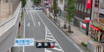 藤沢駅南口を出ていただき、駅を背にして斜め左にございます、藤沢駅南口の信号方向に進みます。