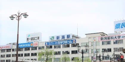 JR新潟駅万代口を出ていただくと、左手にバスターミナルがございます 。左手にバスターミナルがある交差点(ドトールコーヒーが目印)を渡り、東大通りを道なりに萬代橋方面へ進んでください。