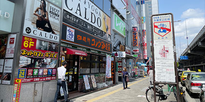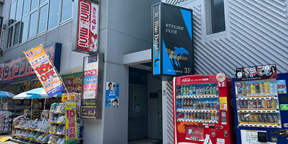 ドラッグストアの右手にビルの入り口があり、5FにRINX大阪江坂店がございます。