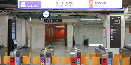 御堂筋線梅田駅の南改札口を出ていただき、左に曲がり、阪急百貨店に向かい直進します。