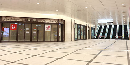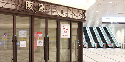 阪急梅田3F改札から出ていただきます。正面のエスカレーター(階段)を下り、さらに直進すると右手に阪急百貨店が出てきます。