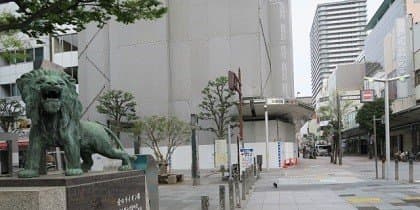 静岡市の人気スポットである青葉シンボルロードを指すライオン像を目印に交差点を左に曲がり、直進すると右側にRINX静岡駅前店の看板が見えてきます。