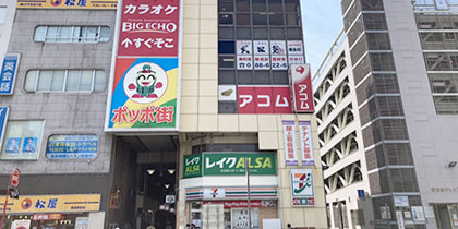 セブンイレブンを右手にポッポ街の中を歩いていると、セブンイレブンを超えて直ぐにビルの入り口がございます。そちらのビルの5Fに当サロンがございます。