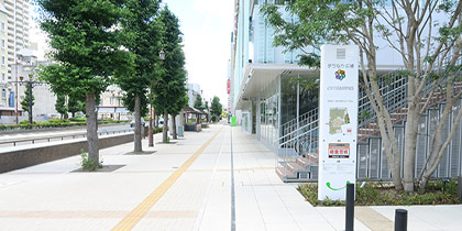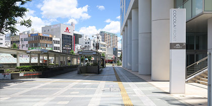 新豊橋駅の改札口を出て右に曲がり、東口から外に出ます。COCOLAAVENUE(ココラアベニュー)前の広場を直進します。