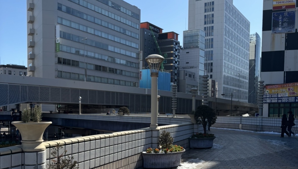 JR上野駅広小路口を出ていただくと、左手にペネストリアンデッキへと上がる階段がございますので登っていただきます。