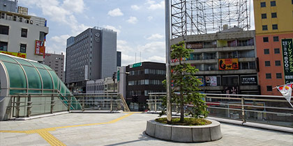 改札を出たら東口を直進していただき、突き当たりを右に曲がりますとペデストリアンデッキ(2F)に出ますので、左に曲がります。